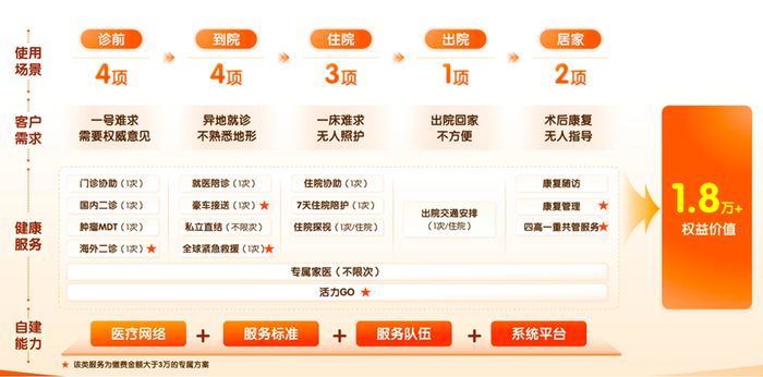 平安岁月长安特定疾病保险的客户,可以在诊前、到院、住院、出院、居家的多场景下,享有14项价值超过1.8万的专属增值服务。