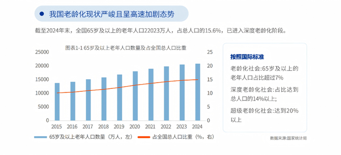 近日,《2025中国养老金金融白皮书》显示,我国老龄化现状严峻且呈高速加剧态势,截至2024年末,全国65岁及以上的老年人口22023万人,占总人口的15.6%,已进入深度老龄化阶段。