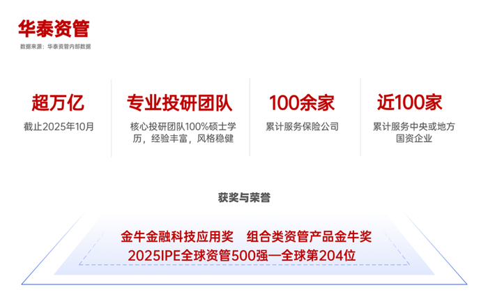 截至2025年10月,华泰资产的资产管理规模超万亿元,其中90%以上为集团外部客户,华泰资产围绕银行保险委托投资、养老金受托管理和项目计划发行设立业务,形成三大业务领域,通过专业、创新、高效的投资与投行服务,为客户提供长期稳定的回报,促进公司业务的快速健康发展。其核心管理团队长期深耕金融与资产管理领域,高管平均从业年限超过20年,有助于保持投资策略的连续性。