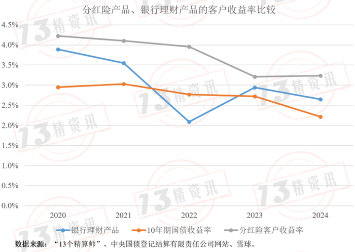 据13精统计,从分红险产品和银行理财产品客户收益率比较来看,2020-2024年期间分红险产品的客户收益率均是高于银行理财产品的。