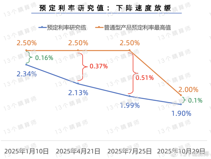 2025年7月末,最新的预定利率研究值公布,由于连续两季低于预定利率25个基点以上,触发下调条件,人身险产品预定利率于9月初非对称性下调。