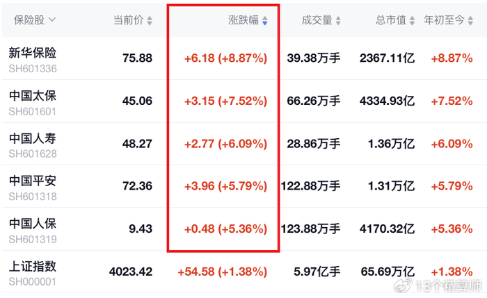 新华保险、中国太保、中国人寿、中国平安、中国人保,涨幅全部超5%,详见上图。