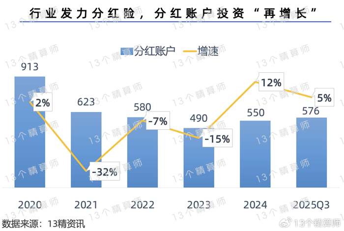 2025年三季度末,25家寿险公司的分红账户,在沪深市场的投资金额为576亿,较年初增长5%。
