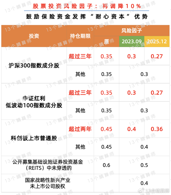 2025年12月,金融监管总局下发《关于调整保险公司相关业务风险因子的通知》,将股票投资的风险因子,在此前下调的基础上,进一步调降10%。