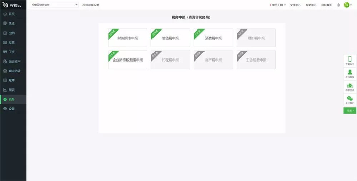 2018年12月 发票模块上线,支持发票模块的发票自动生成凭证;青海省的增值税实现一键报税;一键报税覆盖19个省区。