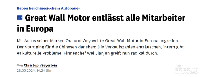 ▲外媒报道长城欧洲总部解散据悉,此次解散的原因一是欧洲电动汽车需求疲软,长城汽车在欧洲销量远不及预期,另一方面是由于欧盟计划最早在今年7月对中国电动汽车征收关税,这会让长城汽车遭受更多损失。