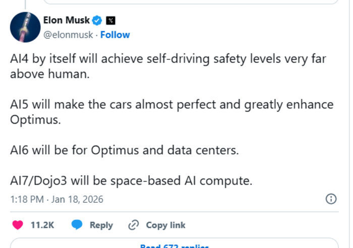 他明确表示,随着下一代车载AI芯片(AI5)的设计已“步入正轨”,研发资源得到释放,Dojo3将以AI7的新身份回归,同时被赋予全新的战略使命。