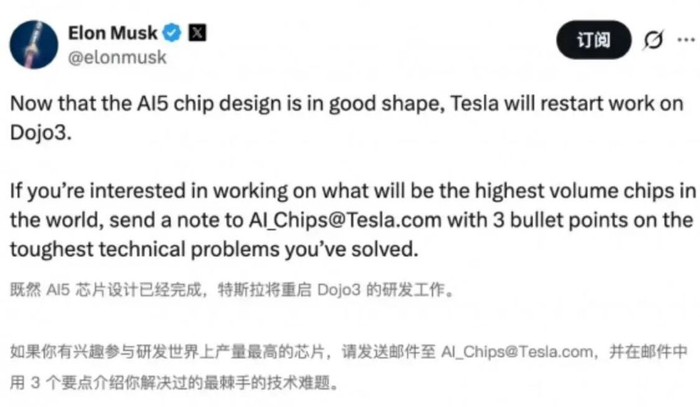 面对如此高强度的迭代挑战,人才密度成为关键。马斯克在宣布重启Dojo3的推文里,直接附上了招聘邮箱,向全球顶尖芯片工程师发出邀约。这一举动也侧面印证了特斯拉为这场算力突围战所做的决绝准备。