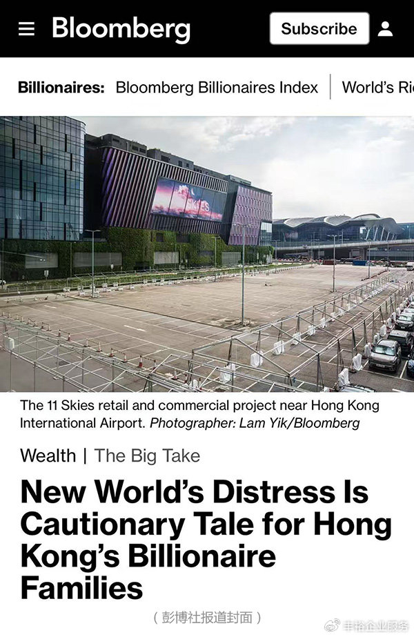 近日,国际财经媒体 彭博(Bloomberg) 在其Big Take 深度特稿《New World’s Distress Is a Cautionary Tale for Hong Kong’s Billionaire Families》中,聚焦香港家族地产集团在高息环境、楼市调整与代际交替下的挑战。