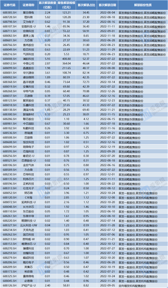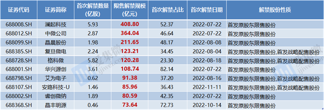 按照解禁规模来看,解禁市值最高的公司是澜起科技为408.8亿元,其次是中微公司、晶晨股份、复旦微电、格科微、华兴源创,分别为364.04亿元、211.65亿元、123.21亿元、120.28亿元、108.74亿元,均超过百亿规模。