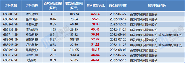 按照解禁规模占总市值来看,7家公司的解禁占比超过50%,分别为华兴源创、晶丰明源、华特气体、清溢光电、宏微科技、澜起科技、炬芯科技,占比分别为82.14%、72.73%、70.88%、69.43%、58.91%、52.37%、51.23%。
