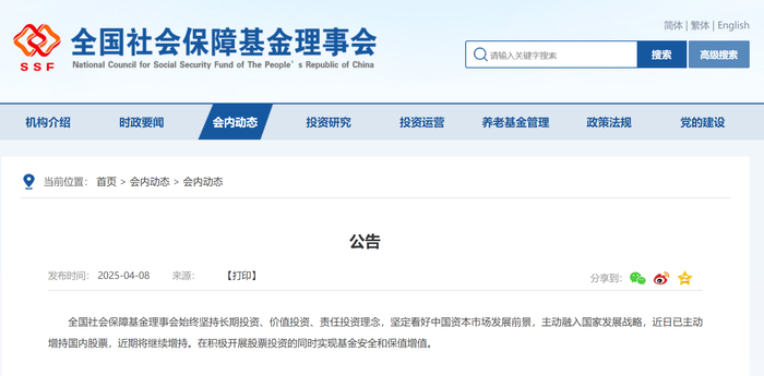 图源:全国社会保障基金理事会官网4月8日,全国社会保障基金理事会发布公告称,始终坚持长期投资、价值投资、责任投资理念,坚定看好中国资本市场发展前景,主动融入国家发展战略,近日已主动增持国内股票,近期将继续增持。在积极开展股票投资的同时实现基金安全和保值增值。