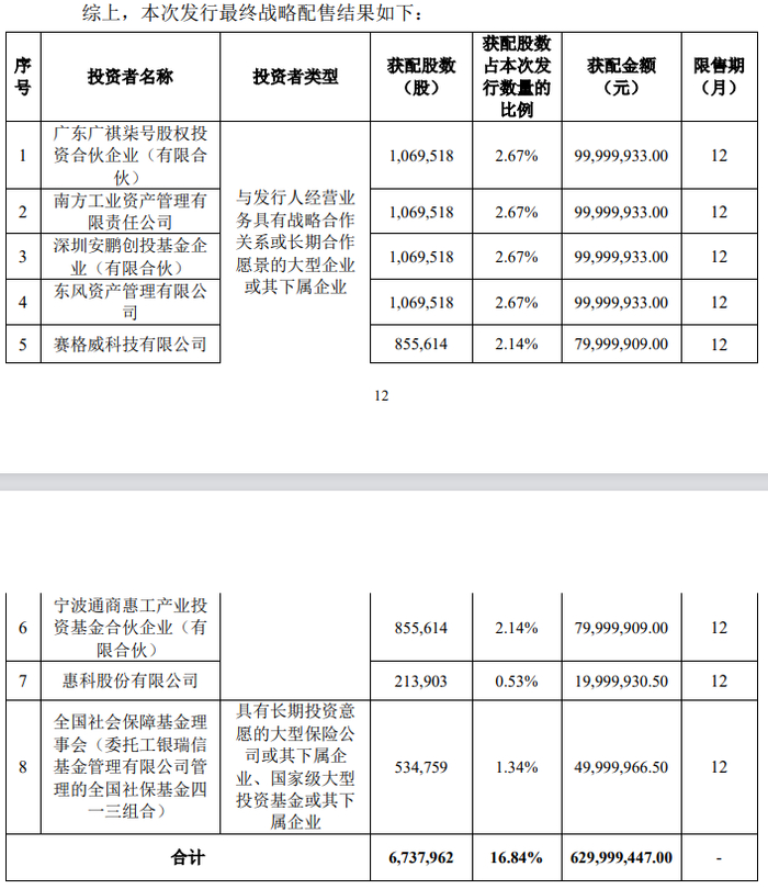其中,广东广祺柒号股权投资合伙企业(有限合伙)、南方工业资产管理有限责任公司、深圳安鹏创投基金企业(有限合伙)、东风资产管理有限公司获配股数额及占比并列第一,达约106.95万股,占本次发行数量的2.67%,获配金额约为9999.99万元,接近1亿元。