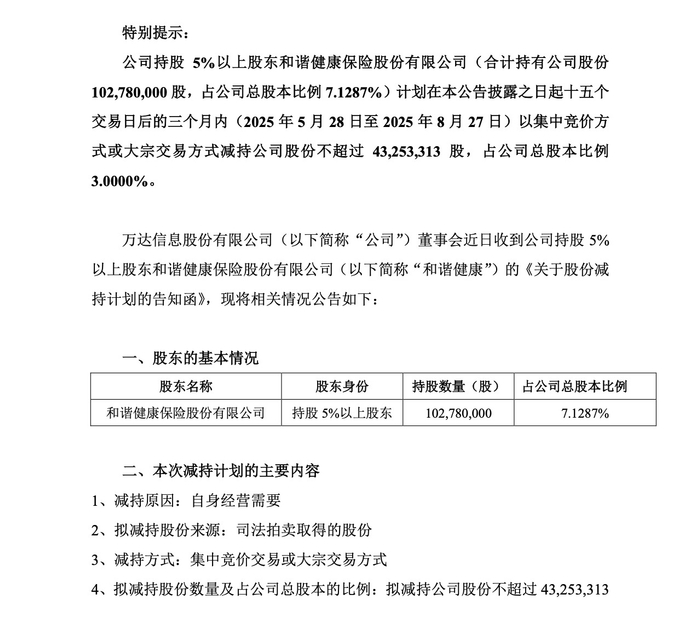 5月6日晚间,万达信息(300168.SZ)公告称,持股5%以上的股东和谐健康保险股份有限公司(下称“和谐健康”)拟减持不超过3%股份。