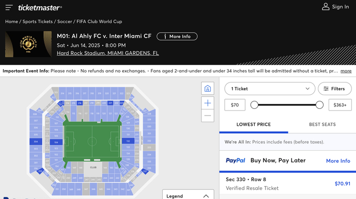 截至6月13日下午6点37分,Ticketmaster显示,同样是在迈阿密硬石球场举行的小组赛,6月18日,皇家马德里世俱杯首战将对阵利雅得新月,当前可售最低票价约231美元/张。而在当地时间7月13日举行的世俱杯决赛,当前可售最低票价已经高达753美元/张,最高票价则超过2800美元/张。