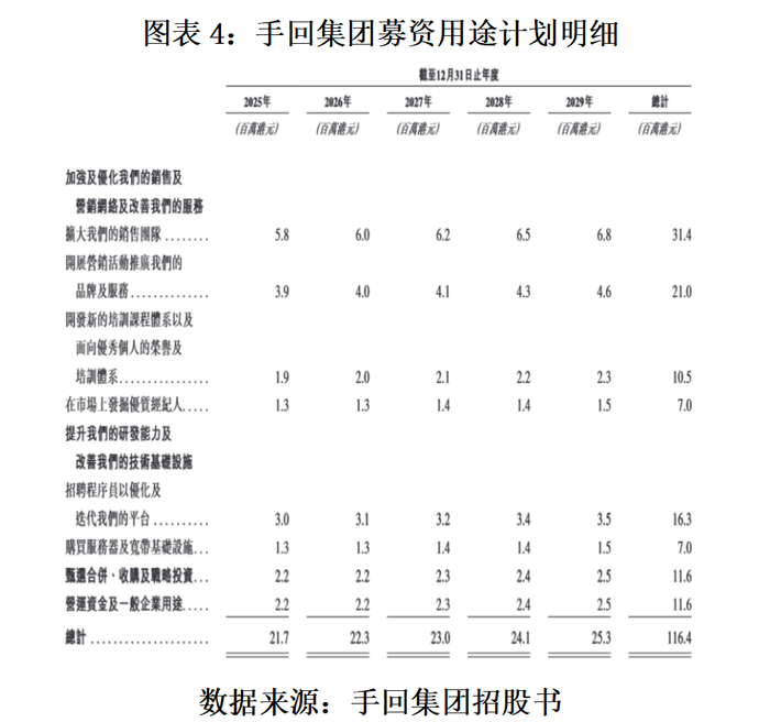 招股书中的“未来计划及募资用途”章节,手回集团表示拟在未来5年进行加强、优化销售及营销网络以改善服务,扩招专业的保险业务人才进行区域性业务扩张,加大智能算理、AI核验、智慧客服等方面的研发投入,以提升技术基础设施和进行产业链并购。