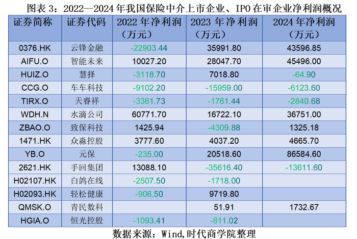 Wind数据显示,2022—2024年,在10家保险中介上市企业以及4家已披露招股书的保险中介IPO在审企业中,有10家企业出现过亏损经营的情形。仅智能未来、水滴公司、众淼控股3家在过去三年连续盈利。另外,青民数科未公布2022年净利润数据,但其在2023—2024年持续经营净利润分别为51.91万元、1732.67万元,净利润规模相对较小。