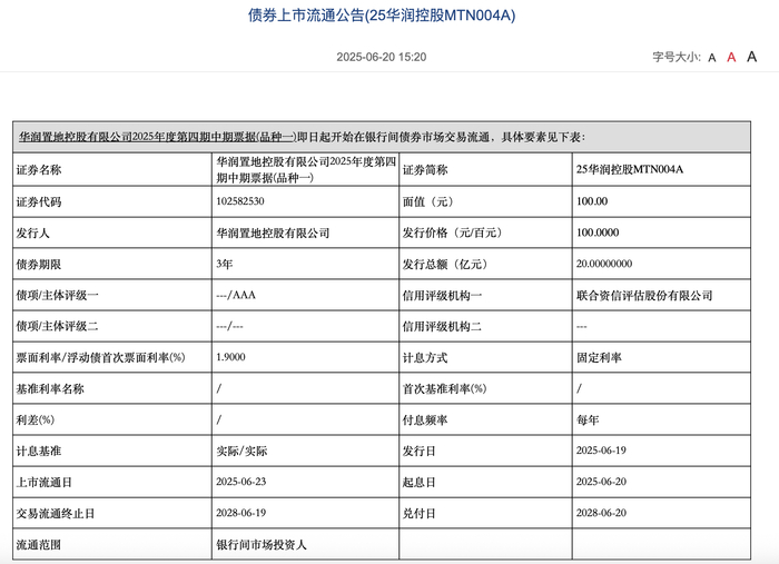 6月19日,华润置地控股有限公司(以下简称“华润置地控股”)发行2025年度第四期中期票据,分别为25华润控股MTN004A、25华润控股MTN004B,发行总额合计30亿元。