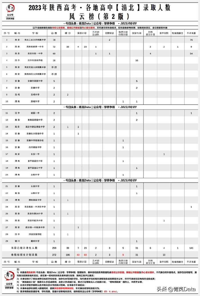 - 西工大附中:没什么悬念,以78人排名第一名,相比去年下降了一点,主要原因在于今年文科发挥得很一般,文一班仅5人考入清华、北大。
