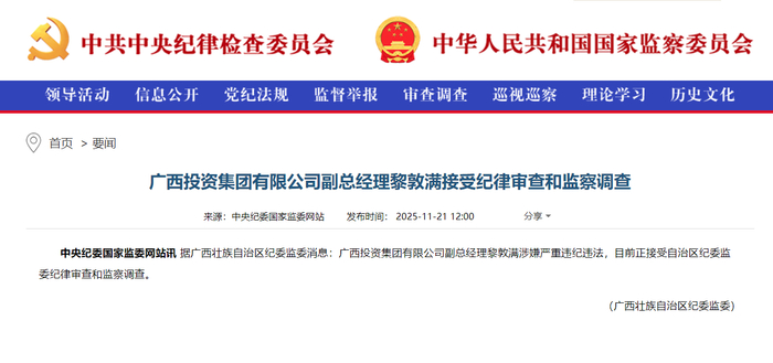 日前,据广西壮族自治区纪委监委消息,广西投资集团有限公司副总经理黎敦满涉嫌严重违纪违法,目前正接受自治区纪委监委纪律审查和监察调查。