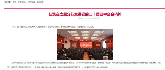 此外山西银行同日还在官网披露,任凯在11月27日以山西银行党委书记的身份在太原分行宣讲。按照惯例,山西银行党委书记、董事长为一人担任,也就是说任凯下一步将出任该行董事长。这也就是意味着,山西银行的“一二把手”全换。