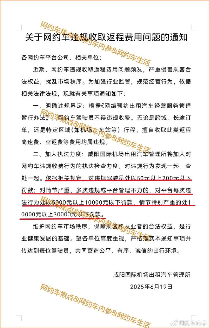 网约车内参讯(文/彭小伟)6月19日,咸阳国际机场出租汽车管理所发布《关于网约车违规收取返程费用问题的通知》,明确规定网约车收取返程高速费属违规行为。