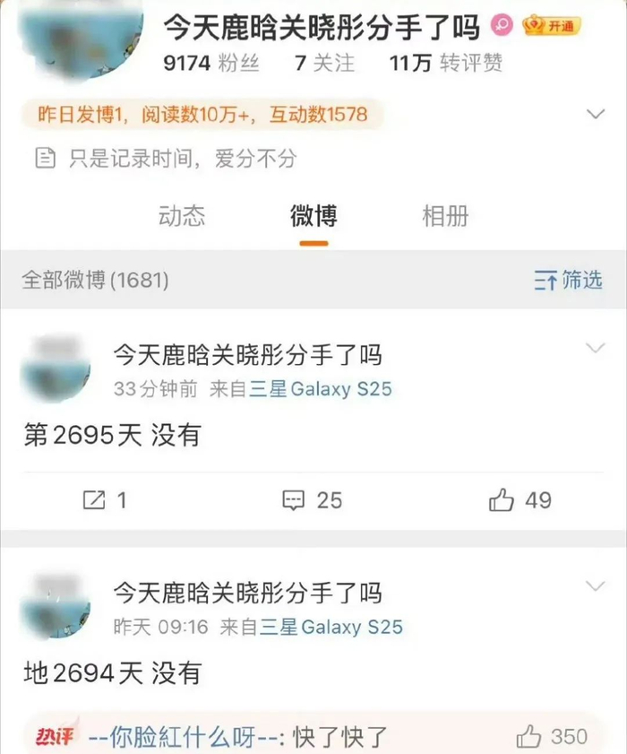 #今天鹿晗和关晓彤分手了吗#,第2694天,没有;