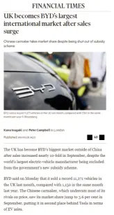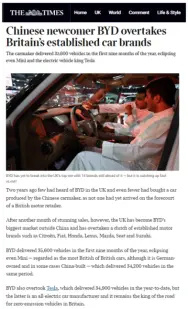 比亚迪在英国市场的爆发式增长,引发了英国主流媒体的高度关注,标志着中国汽车品牌在全球高端市场的形象实现质变。英国广播公司以“中国电动汽车巨头比亚迪9月英国销量创下新高”为题进行报道,认可其在新能源领域的技术实力。《泰晤士报》直言“中国新晋品牌比亚迪超越英国老牌汽车品牌”,感慨“两年前英国几乎没人听说过比亚迪”,《金融时报》则强调“英国成为比亚迪最大的国际市场”,凸显其在全球布局中的战略地位。