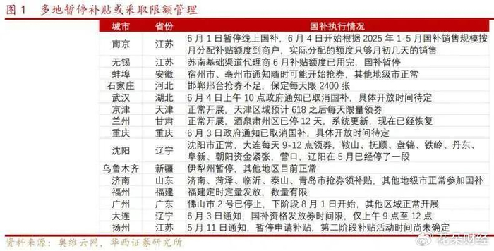 早在6月初,重庆、江苏、广东、湖北等地已陆续收紧补贴。比如南京在6月1日起暂停线上国补,改为按月分配额度至商户,实际额度仅够月初几天销售;而无锡苏南代理商6月补贴额度提前耗尽;武汉、重庆则直接取消国补,开放时间待定。