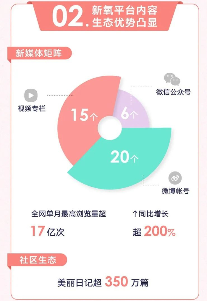 目前,新氧原创内容新媒体矩阵包括6个微信公众号、20个微博账号和15个视频专栏,2020年Q3,新氧新媒体矩阵全网单月最高浏览量超17亿次,同比增长超200%。新氧社区覆盖了用户医美需求前、中、后期全链条的信息提供和决策辅助,其中用户在新氧平台上亲自撰写、真实分享自己接受医美服务过程与感受的“美丽日记”,累积量已超过350万篇。