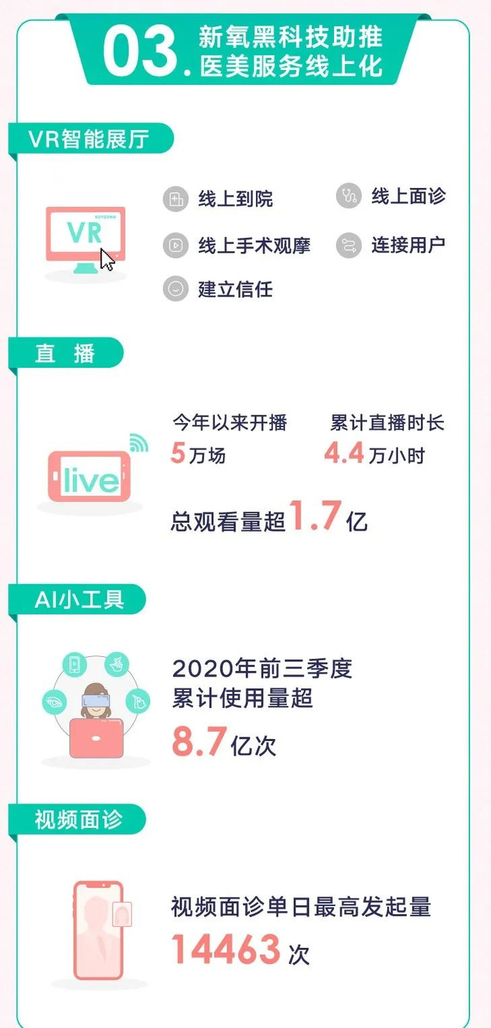 此外,AI技术在构建新氧用户服务生态,提升服务体验和决策效率上,也扮演着不可或缺的角色。以AI小工具为例,目前新氧已开发包括魔镜测脸、皮肤检测、术后交流等十余款小工具,覆盖医美用户术前、术中、术后等各个关键节点,助推医美服务线上化。2020年前三季度,新氧AI小工具累计使用量超8.7亿次。