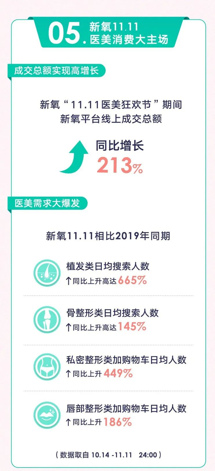 以用户为根基的社区生态繁荣,极大促进了用户需求爆发与平台交易能力的提升。财报数据显示,2020年Q3,新氧平台促成的医美服务交易总额为11.101亿元人民币。在今年新氧“11.11医美狂欢节”期间,10月14日-11月11日24时,新氧平台线上成交总额同比增长高达213%。此外,国内医美消费者需求爆发特征也在新氧平台呈现出来,相比2019年同期,新氧“11.11医美狂欢节”期间,植发类日均搜索人数同比上升高达665%,私密整形类加购物车日均人数同比上升449%。