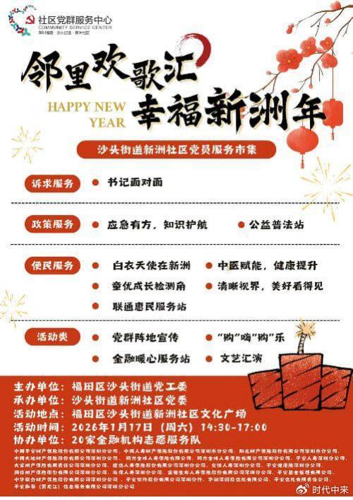 2026年1月17日下午,福田区沙头街道新洲社区文化广场张灯结彩、人声鼎沸,处处洋溢着新春的喜悦与邻里温情。由沙头街道党工委主办、新洲社区党委承办,联合中国平安产险深圳分公司、阳光财险等20家金融机构爱心企业共同协办的“邻里欢歌汇,幸福新洲年”党员服务市集在此热力开启。活动以党建为引领,融合便民服务、政策宣传、健康义诊与金融教育,打造了一场集“温度、深度、趣味”于一体的社区公益盛宴,吸引两千余名居民热情参与。