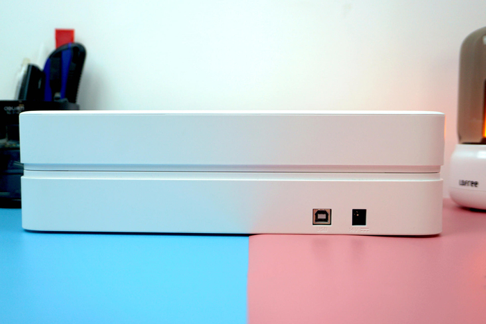 在机身顶部设计了一个实体的电源开关按键,右边则分别是打印指示灯和连接状态指示灯。整体设计非常简洁,各项操作和产品的工作状态都能一目了然,这方面可以说也算是延续了传统打印机的优势。