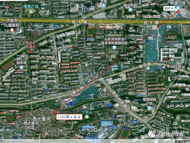 (槐荫区,西十里河村卫星图)这里是济南主城西部很核心的位置了,它的东北侧约1.4公里是和谐广场,正北侧约800米是济南市儿童医院,村庄东侧还有主城难得的山体——丁字山,村庄还紧邻兴济河、南辛康养公园,整体区位很不错。