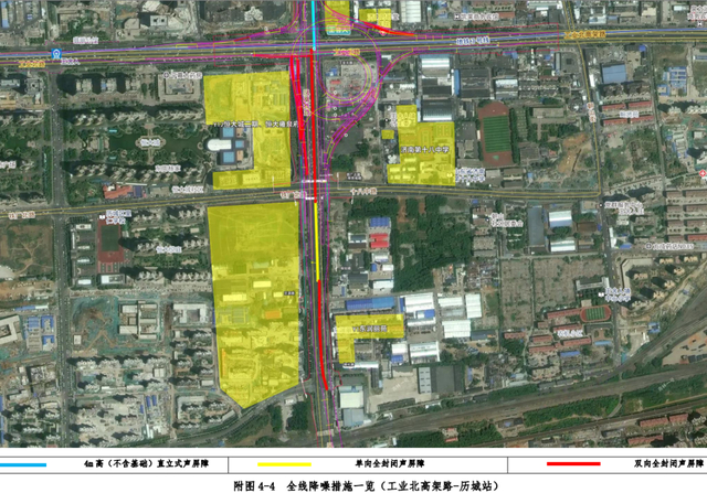 (工业北高架-历城站声屏障设计)这是凤凰高架在工业北高架至历城站段的规划,其中红色路段将采用双向全封闭声屏障,黄色路段将采用单向全封闭声屏障,蓝色路段将采用直立式声屏障。