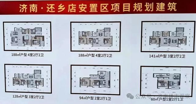 安置房规划户型面积60-188㎡,房型分为60㎡、94㎡、128㎡、141㎡、188㎡六种,由被安置人根据自己的安置面积自行搭配选择,每套安置房配置一个地下室,一个使用权车位。