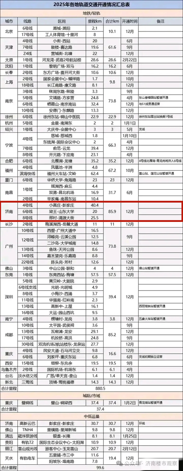 (6号线示意图)如此,到今年年底,济南有望开通的地铁里程将达到约86公里。有网友整理了2025年拟开通地铁的城市,济南有望开通的地铁里程位居全国第一!