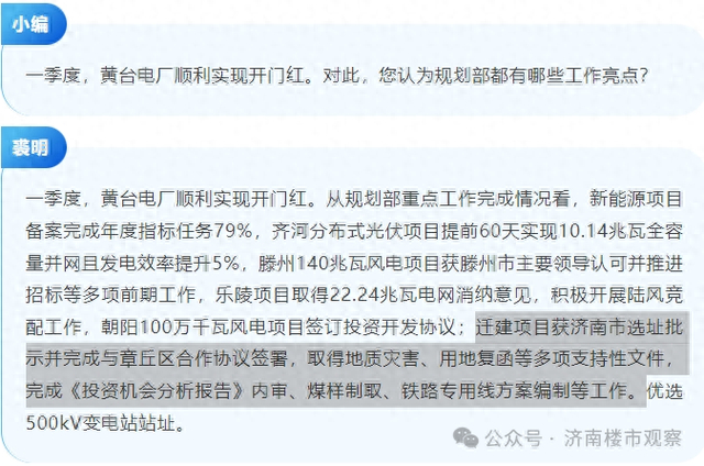 首先,在今年一季度,黄台电厂迁建项目已获济南市选址批示,并完成与章丘区合作协议签署,取得地质灾害、用地复函等多项支持性文件,完成《投资机会分析报告》内审、煤样制取、铁路专用线方案编制等工作。