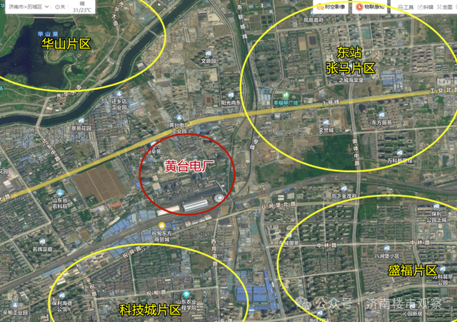 (黄台电厂大致位置)其东北侧是济南东站张马片区、东南侧是历下盛福片区,南侧铁路以南是科技城片区,西北侧不远处是华山片区,这些都是济南楼市热点区域。