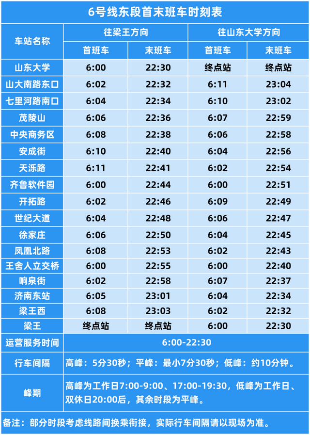 6号线东段运营时间为6:00-22:30,每个站点时间如下: