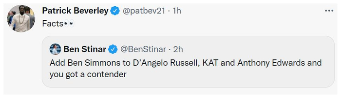 谈到西蒙斯下家时,NBA记者Ben Stinar写道:“本-西蒙斯加上德安吉洛-拉塞尔,唐斯和安东尼-爱德华兹,这支球队会成为一个有力的竞争者。”随后,森林狼新援贝弗利转发该记者推特并写道:“事实。”