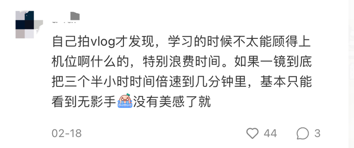 而且,真正投入时间备考的学习博主,很难有多余的时间和精力去拍摄、剪辑、运营账号,尤其是那些多角度、精致的视频内容。有网友表示“从暑假开始打卡了100多天的plog,前期还加滤镜贴纸,后期真的能坚持拍图就不错了。天天做那些精致的vlog真的很费时费力,真正学进去了笔记和练习都是草稿纸,真的做不来天天精致。”很多人在尝试成为学习博主之后,因为过于耗时而选择放弃、专心备考。