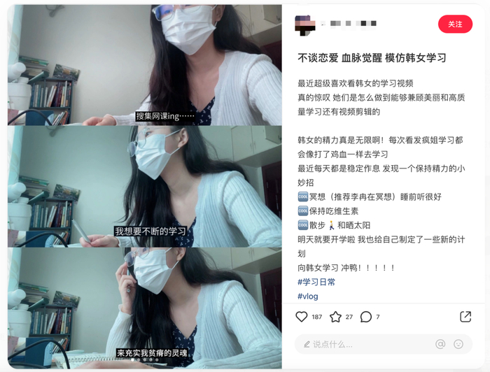 最近,以“发疯姐”为代表的韩国学习博主们在小红书等社交平台上走红,网友们甚至将这一类“玩命儿”式学习的韩国学习博主们统一用“韩女”来代称。提到学习博主届的“韩女精神”,指的就是那些卷到极致、疯狂学习的状态。