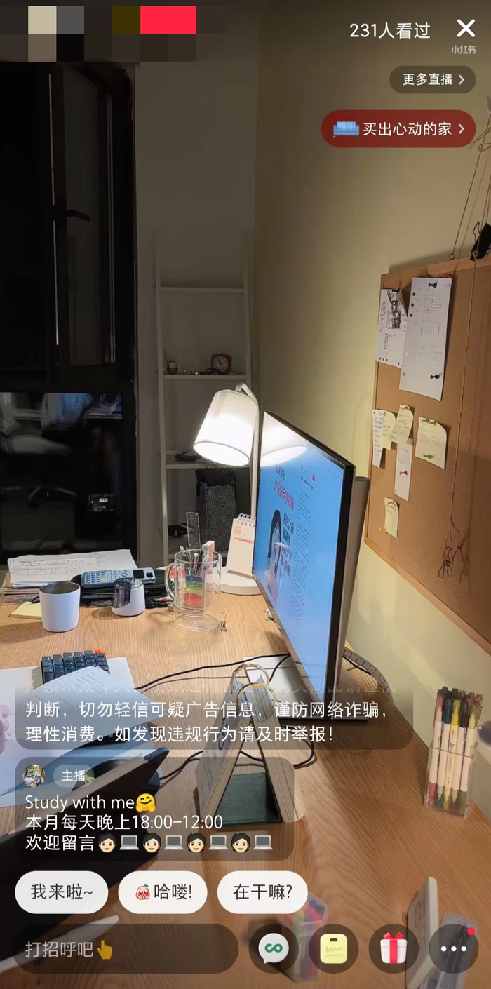 学习博主们通常以vlog为主分享自己的学习状态,部分博主也会配合直播。比如@彭酱酱LINYA此前会在B站定期直播学习,在线观看人数可达到四、五万人。不过也有很多仅直播的博主,在B站、小红书等平台,很多博主直播自己看书、学习、写稿等过程,以沉浸式的内容去吸引观看。