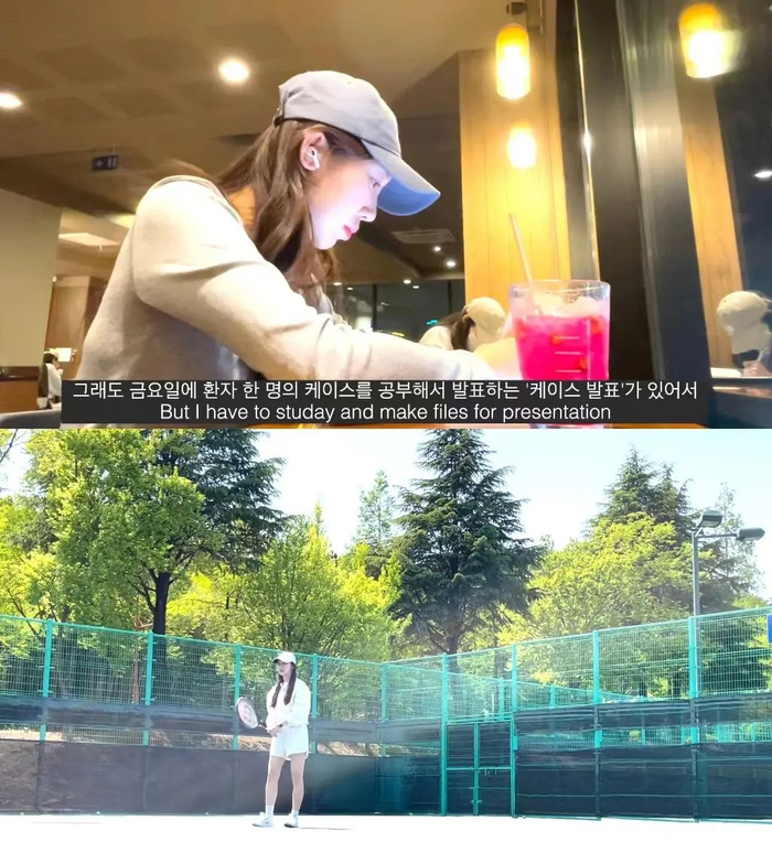 除了呈现超长的学习时长,这一类博主还会保持规律的运动、护肤,学习过程中也会精心搭配好服装与妆容。比如@sunsun在学习之余,还保持着打网球的习惯。