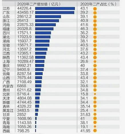 但是这并不能反映出江苏真实的工业实力,对比真实的工业实力,还要看工业增加值,根据统计江苏省2020年第二产业的增加值是4.42万亿元,而广东省的第二产业增加值是4.34万亿元,广东省要弱于江苏省。不仅如此广东省在第二产业的占比方面也达到43.1%,高于广东的39.2%。
