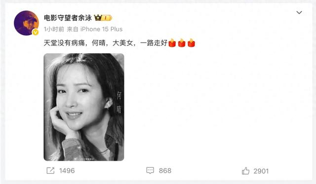“天堂没有病痛,何晴,大美女,一路走好。”