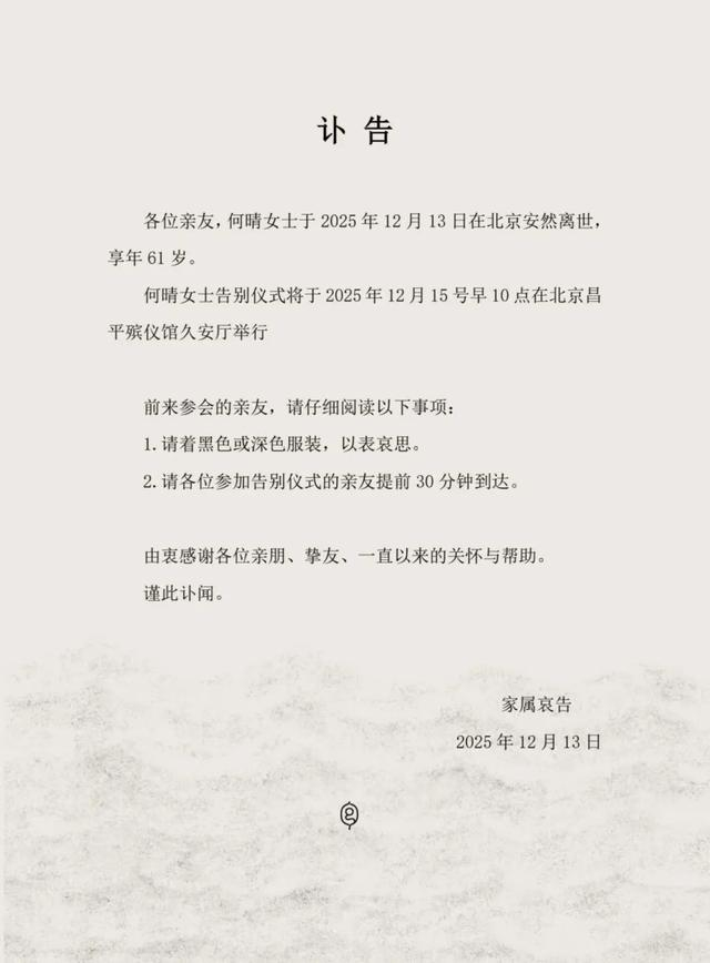 12月14日,余泳在社交平台发布黑白肖像照,确认了何晴去世的消息。