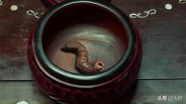就见缸里盘着一条大蛇,通体乌黑,头上长着鸡冠子。这东西太邪乎了,家里面咋有这东西呢?不行,万一让它爬出来咬到人可就麻烦了。于是赶紧盖上缸盖,紧接着去灶房吩咐人烧了一大锅开水,再用木桶提着开水,回到后院那间小屋,将开水倒进缸里,活活把那条黑蛇给烫熟了。好在荥阳郡不属于广东,不然这么一大缸的蛇羹,还不得争抢着喝光。